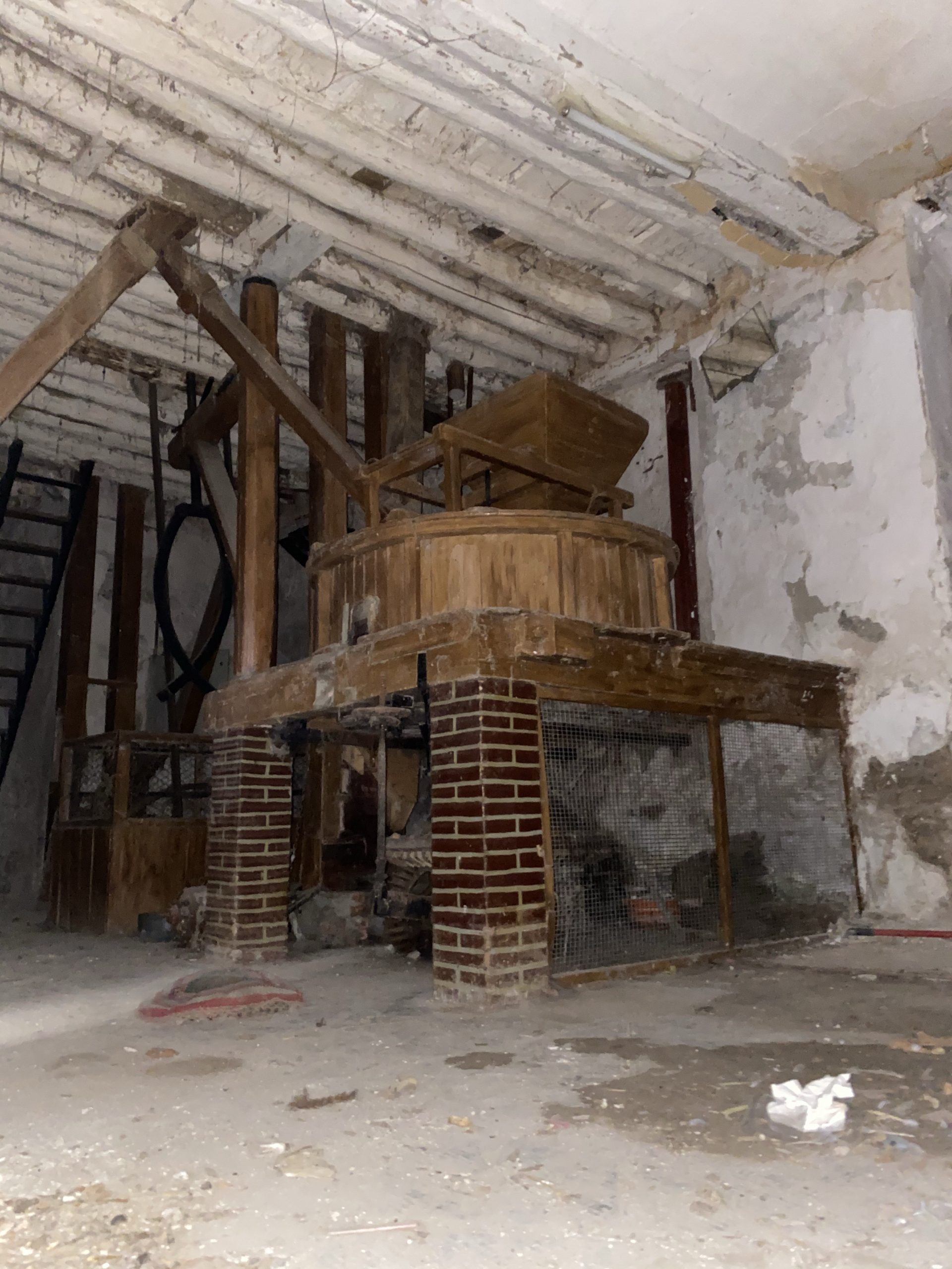 Molino. Fachada principal mal intervenida. Maquinaria en el interior del molino.