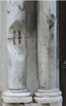 La portada se está deteriorando a pasos agigantados en los últimos diez años, al agrietarse los fustes de las columnas (no pilastras como dice Ayuntamiento y Cultura), los capiteles y el entablamento. Alarmante es el desprendimiento de parte de uno de los fustes de una de las columnas, hecho que pueden observar ustedes en este artículo.